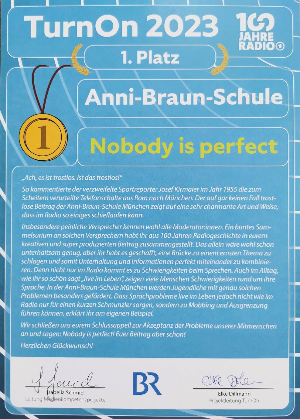 Unter dem Titel 'Nobody's perfect!', so heißt übrigens seit Jahren die Schülerzeitung der Anni-Braun-Schule, reichte unsere Schulradiogruppe einen Beitrag beim Wettbewerb des Bayrischen Rundfunks ein - und gewann den 1.Platz!