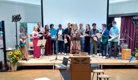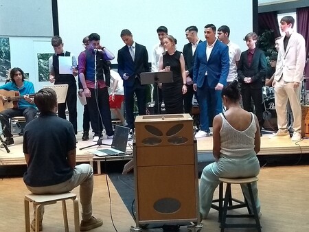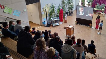 Die Stimmung in der gut gefüllten Aula war super - viele Gäste waren tief berührt von den Bildern, der Musik und von den Texten - die von Schülern angebotenen Snacks wurden alle ausverkauft und auch der Getränkeverkauf brachte guten Gewinn.