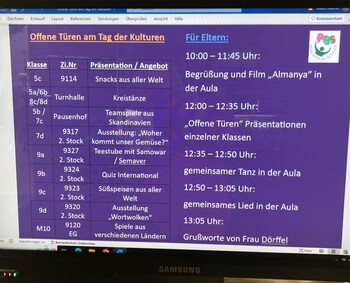 Neben Filmen und Gesprächen zum Thema präsentierten die Schülerinnen und Schüler in ihren Klassenzimmern z.B. kulinarische Köstlichkeiten aus verschiedenen Ländern, Ausstellungen z.B. über internationale Herkunft unserer Lebensmittel , Märchen aus aller Welt, Schreibwerkstätten, eine 'original' türkische Teestube und vieles mehr.